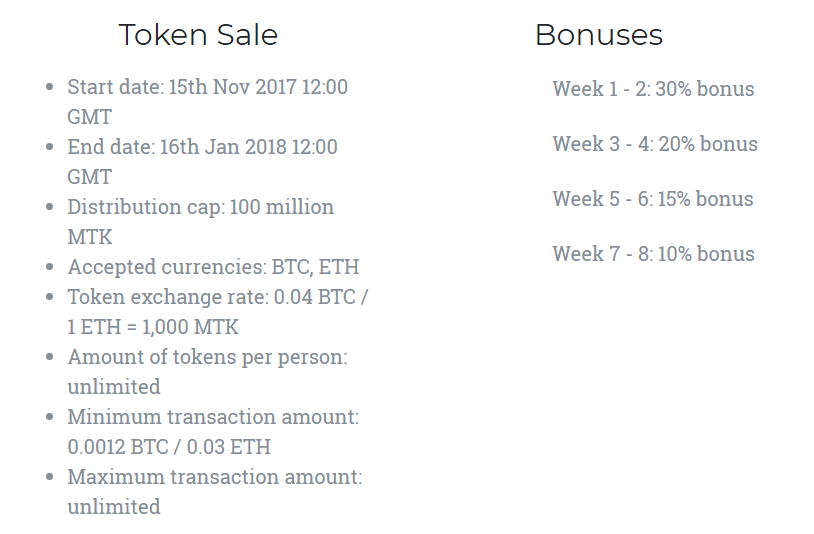 Berbicara tentang harga, untuk 1 ETH Anda akan mendapatkan 1000 MTK token. Lihatlah gambar di bawah ini untuk melihat bagaimana token didistribusikan dan bonus yang mereka tawarkan: